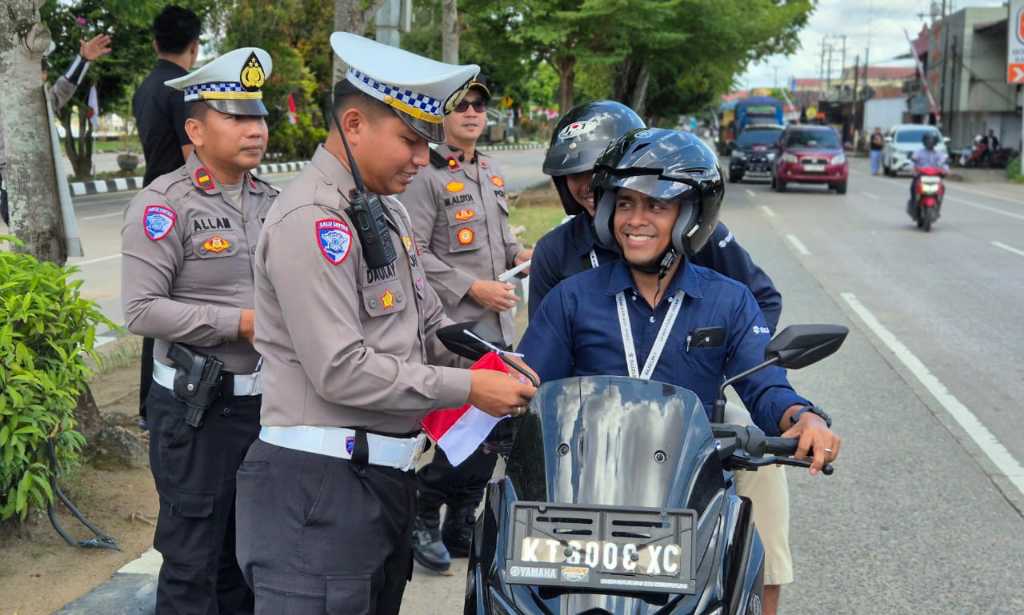 AksaraMedia.com | Tenggarong – Dalam rangka menyambut Hari Ulang Tahun (HUT) ke-80 Kemerdekaan Republik Indonesia, Kepolisian Resor Kutai Kartanegara (Polres Kukar) menggelar aksi simpatik dengan membagikan bendera Merah Putih dan bunga kepada para pengguna jalan, Selasa (5/8/2025). Kegiatan ini menjadi salah satu bentuk nyata upaya Polres Kukar dalam menanamkan semangat nasionalisme dan memperkuat rasa cinta Tanah Air di tengah masyarakat.