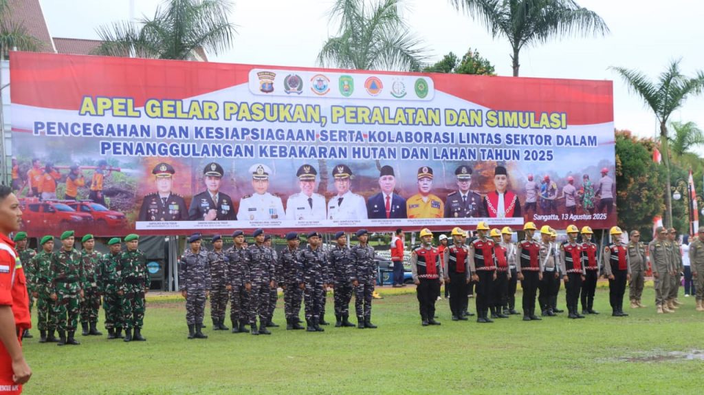 AksaraMedia.com | Kutai Timur — Dalam upaya memperkuat kesiapsiagaan menghadapi musim kemarau yang rawan kebakaran hutan dan lahan (Karhutla), Pemerintah Kabupaten Kutai Timur (Kutim) menggelar apel pasukan, pemeriksaan peralatan, dan simulasi penanggulangan Karhutla pada Rabu pagi (13/8/2025).