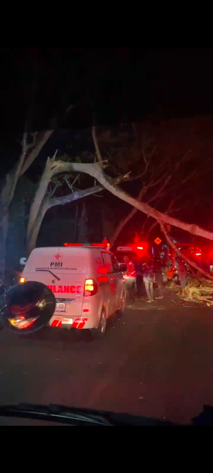 Salah seorang warga yang berada di sekitar lokasi menyebut tumbangnya pohon tersebut cukup mengejutkan. “Anginnya memang kencang sekali sejak sore, tiba-tiba pohon itu ambruk menimpa pengendara. Kami langsung panik dan mencoba menolong sebelum petugas datang,” ungkapnya.