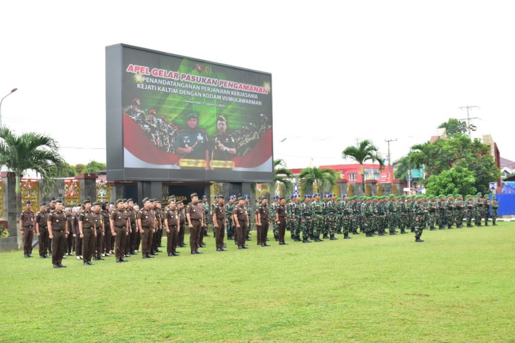 Samarinda, AksaraMedia.com – Kejaksaan Tinggi (Kejati) Kalimantan Timur bersama Kodam VI/Mulawarman menggelar apel gelar pasukan pengamanan di halaman Kantor Kejati Kaltim, Jalan Bung Tomo, Samarinda Seberang, Rabu (27/8/2025). Kegiatan ini dirangkaikan dengan penandatanganan perjanjian kerja sama sebagai langkah konkret memperkuat sinergi antara kedua institusi.