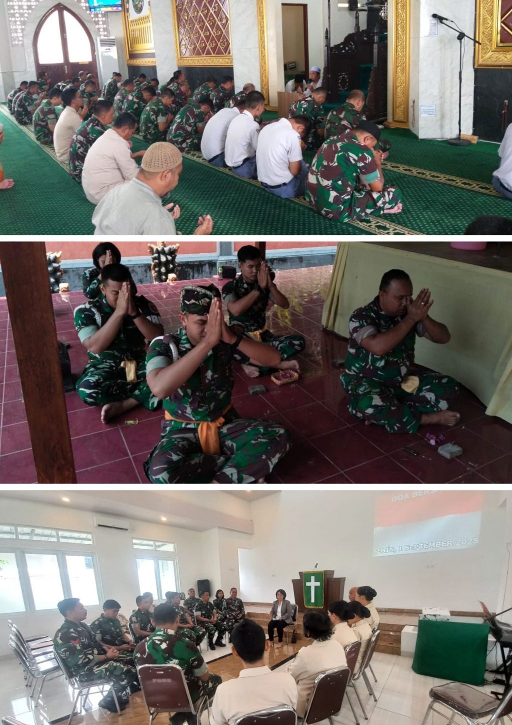 Di kalangan umat Islam, kegiatan dipusatkan di Masjid Sudirman Kodam VI/Mulawarman. Usai salat Dhuhur berjamaah, Ust. H. M. Mujahid, S.Pd., Dai LDNU Kota Balikpapan, memimpin lantunan doa dengan ayat-ayat Al-Qur’an, memohon agar Indonesia dijauhkan dari perpecahan dan diberi keselamatan. Kehadiran para pejabat utama Kodam, termasuk Kasdam VI/Mulawarman dan Kapoksahli Pangdam, semakin menegaskan pentingnya doa tersebut.